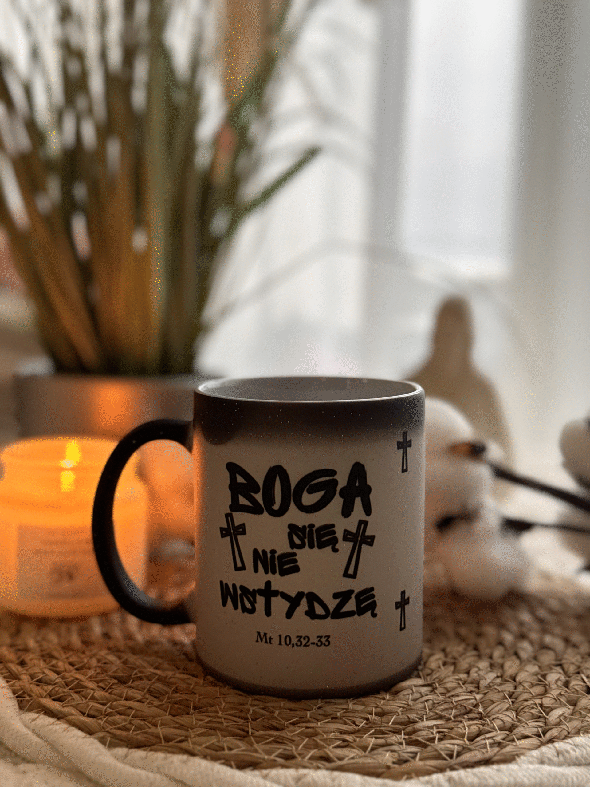 Biały magiczny kubek „Boga się nie wstydzę” z brokatem